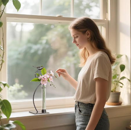 Bring a little poetry to your plant care with the Birdsong Propagation Tube Stand. This decorative stand features a graceful metal frame with a charming bird perched on top, paired with a clear glass tube for rooting cuttings or displaying fresh stems. The elegant design fits easily on desks, shelves, or windowsills, turning every new leaf or root into a stylish display. Perfect for propagating your favorite plants or adding a hint of nature to your workspace, this stand makes a thoughtful gift for plant lovers and anyone who enjoys meaningful accents at home.