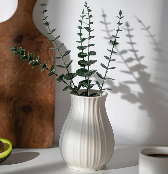 Nestled within a gracefully ribbed ceramic vase, this arrangement infuses tables, mantels, or windowsills with a sense of renewal and understated elegance. The sculpted vase’s classic silhouette lends timeless beauty, perfectly framing the blooms and catching the light in every room.