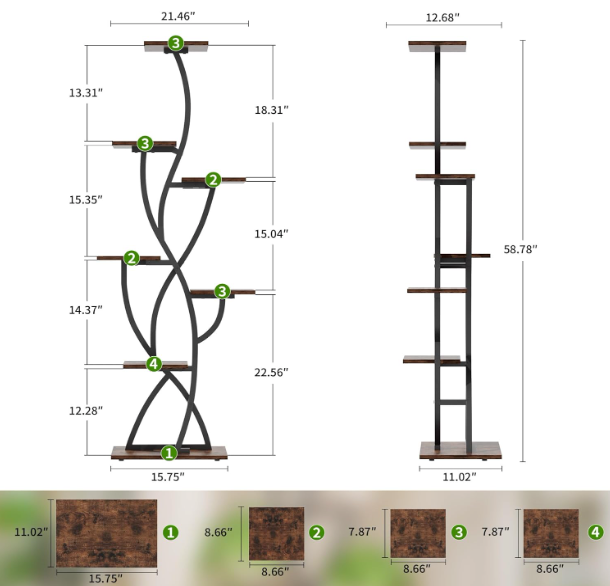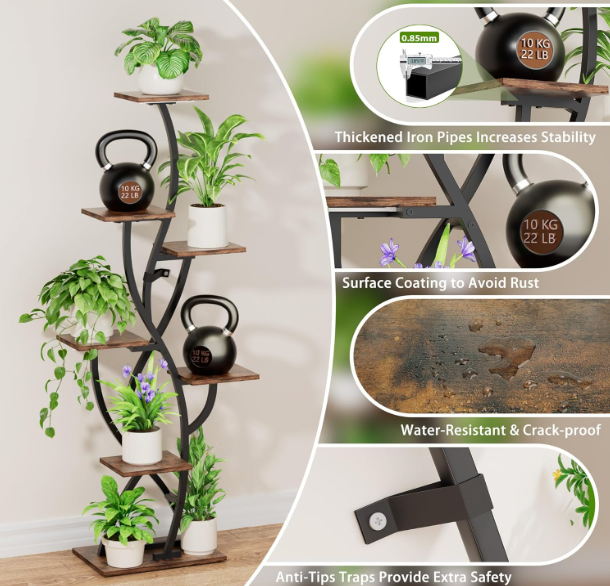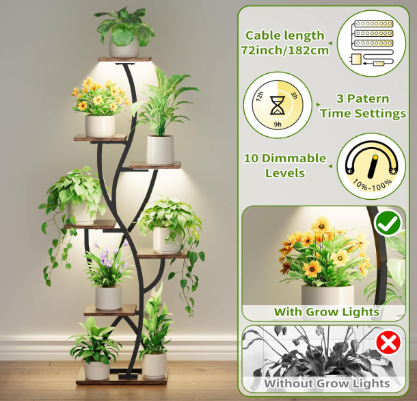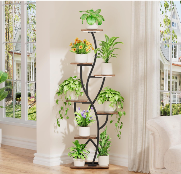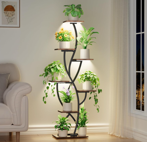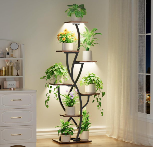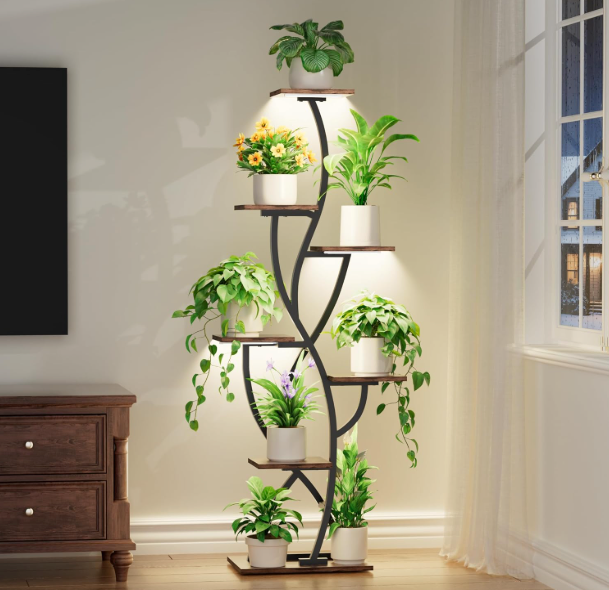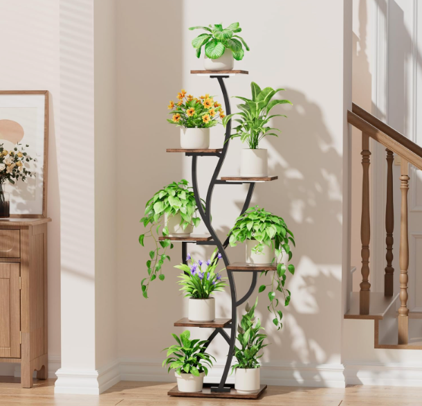 With 8 staggered shelves, it creates a beautifully layered display without taking up excess floor space — perfect for living rooms, bedrooms, or brightening up darker corners. The sturdy metal frame and rich wood finish deliver both stability and elevated style.